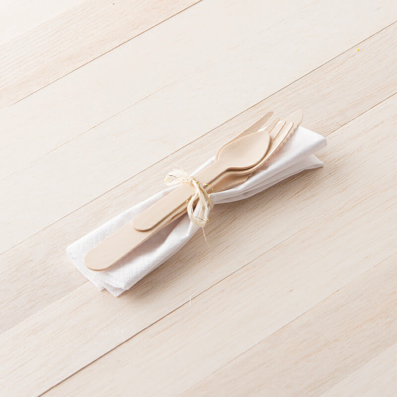 + juego de cubiertos de madera tenedor, cucharita y cuchillo con una servillea tradicional